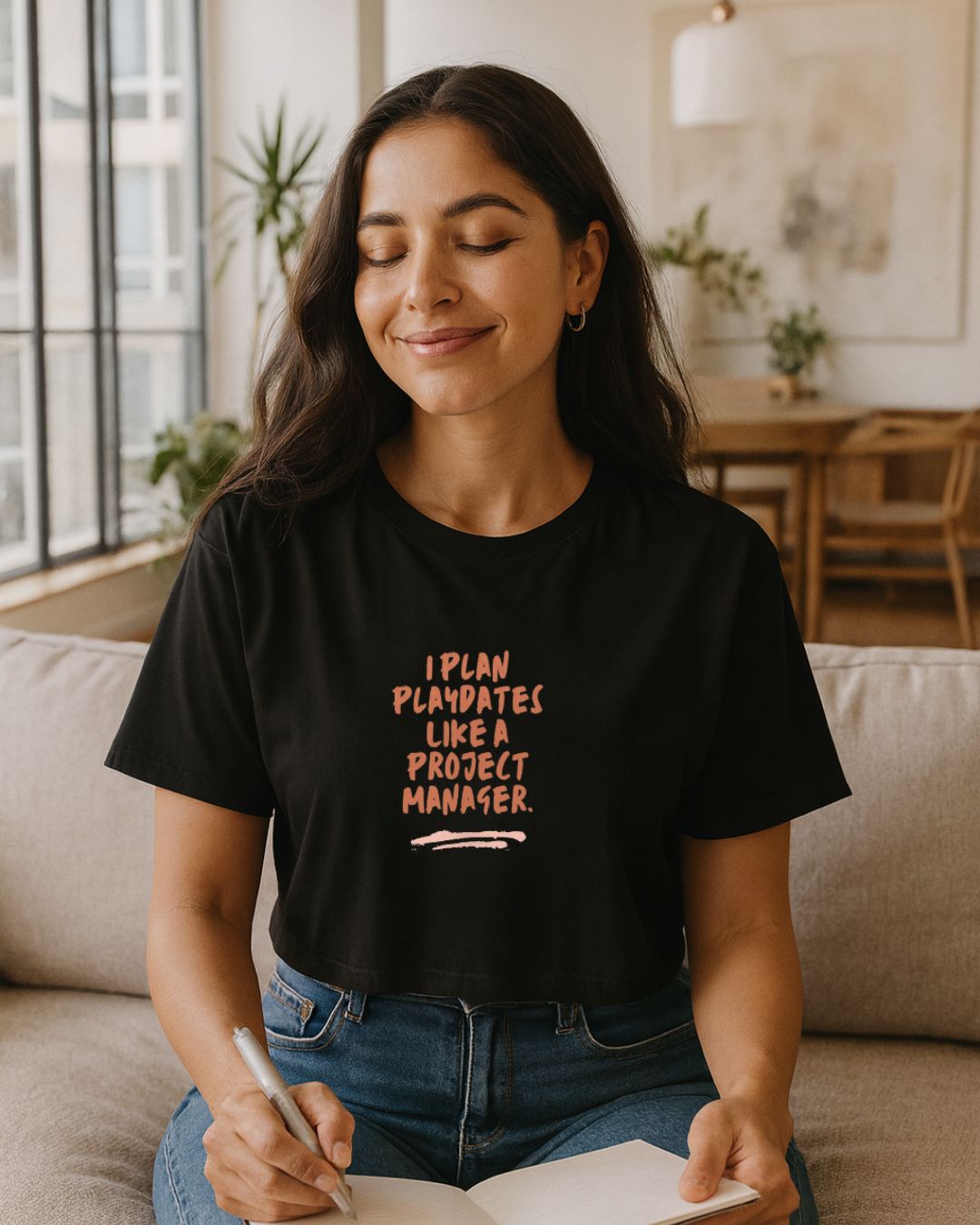 The relaxed fit, dropped shoulders, and cropped cut keep you effortlessly stylish, whether you’re scheduling play dates or negotiating over Goldfish crackers. With its witty affirmation, “I Plan Playdates Like a Project Manager,” this top doesn’t just celebrate your to-do list — it turns it into your crown.