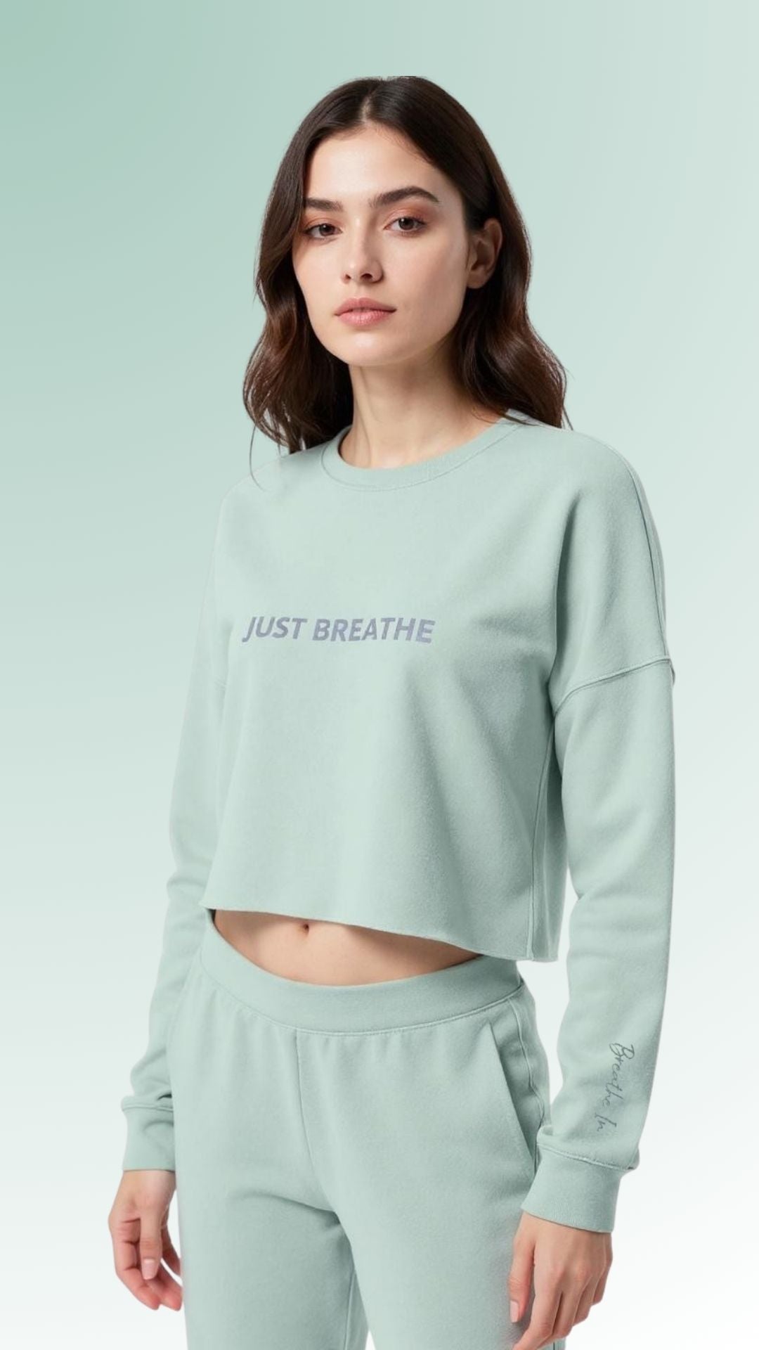 Whether cropped in mint or premium in bone and white, this crewneck carries breath into your day. Embroidered with “Just Breathe” on the chest, “Breathe In” on one wrist, and “Breathe Out” on the other, every glance is a grounding cue. Research shows intentional breath lowers cortisol — and now your clothing reminds you to pause. Premium cotton blends and calming pastels double as both elevated style and emotional reset.
