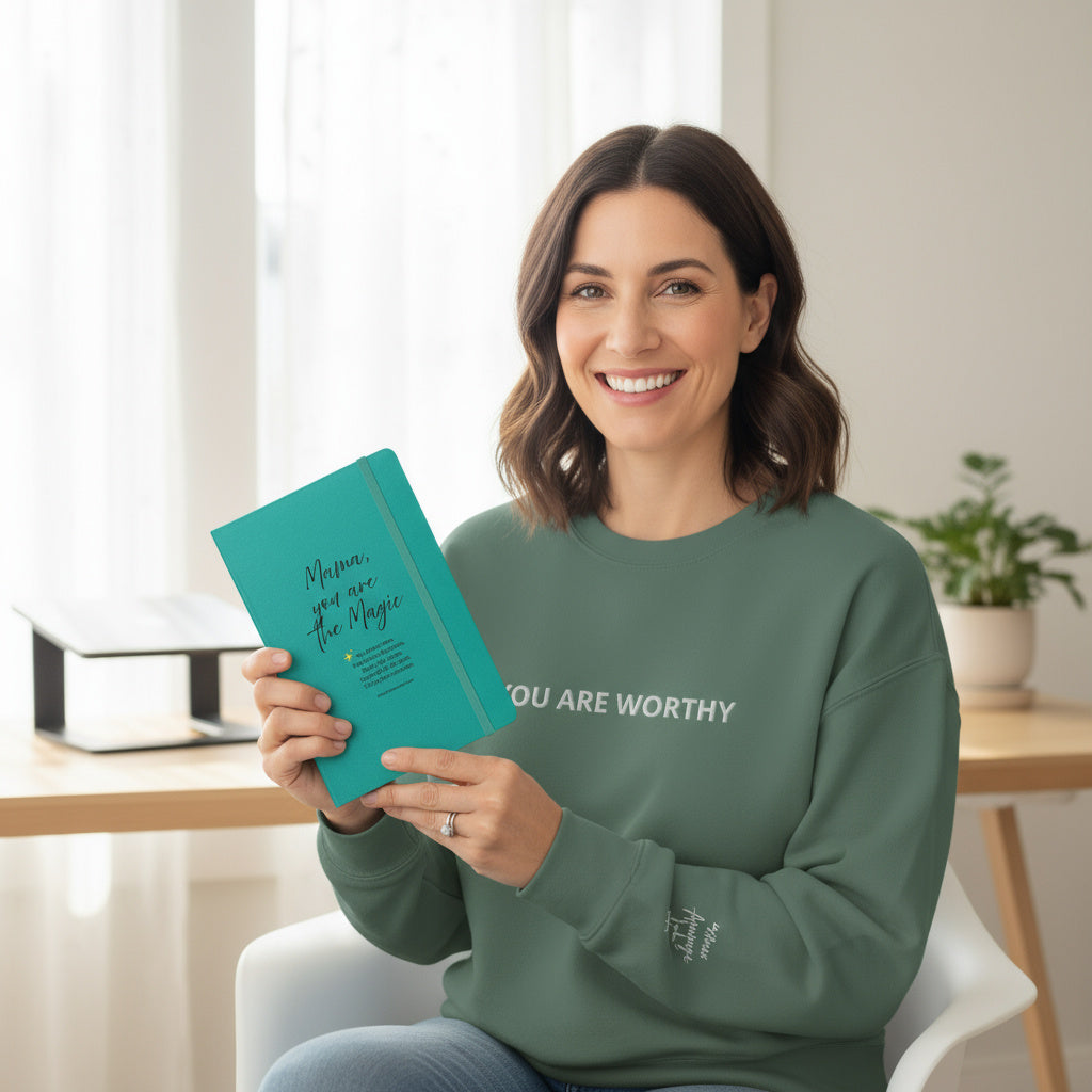 Your safe daily landing place — a premium hardbound notebook with 80 smooth, lined pages, made on demand to honor both you and the planet. A daily dose of grace for the mama who carries the invisible load, who wakes up tired but still shows up with love, who sometimes wonders if she’s doing enough — here’s your daily reminder: you already are.