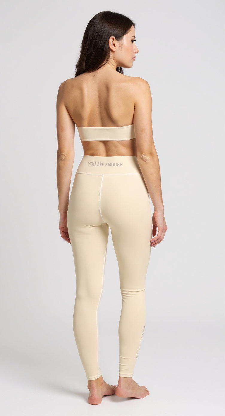 These buttery-soft leggings don’t just sculpt your body — they rewire your mind. With “You Are Enough” subtly tone-on-tone printed on the back waistband, they act as your private ritual and public reminder. Backed by enclothed cognition research, what you wear shapes how you think: a waistband whisper can quiet anxious loops and spark self-compassion.