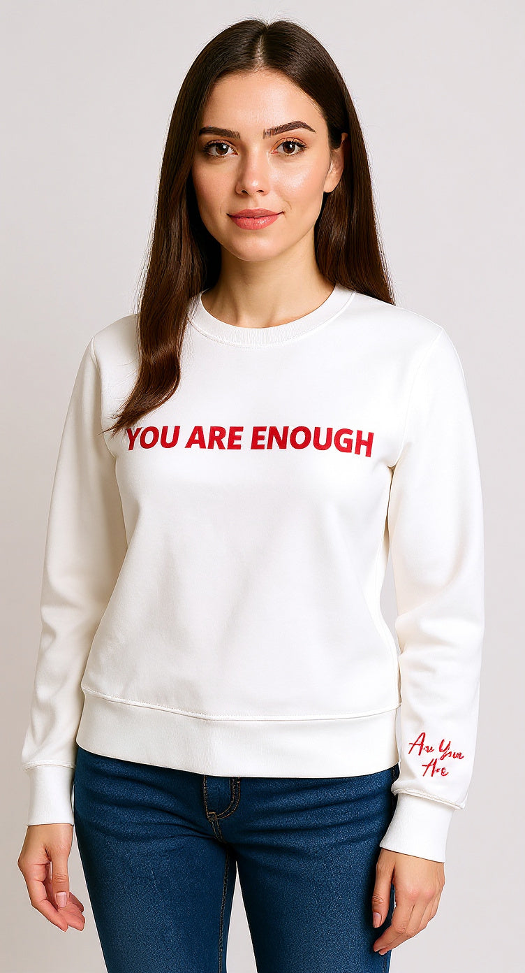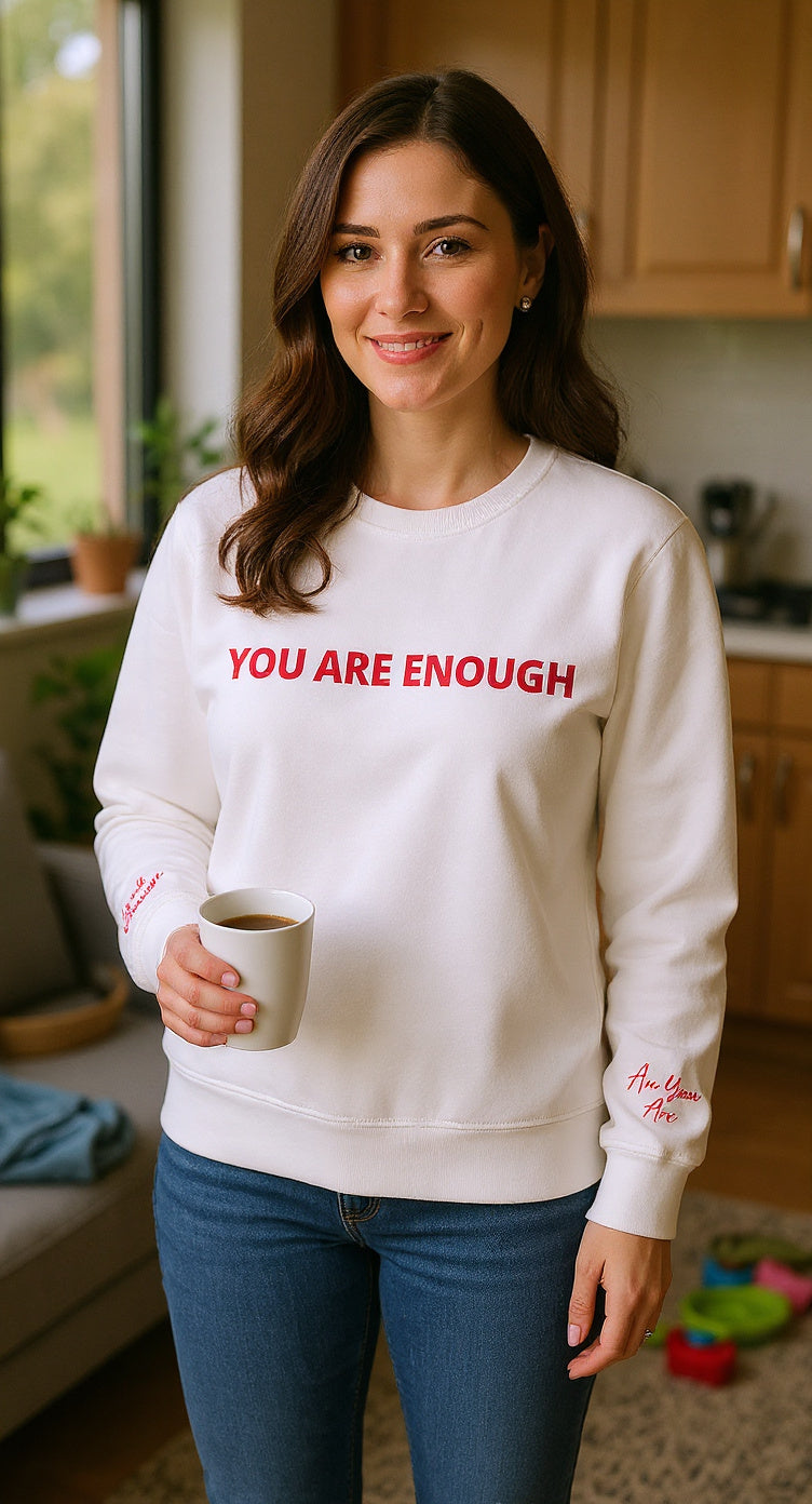 ⦁ Embroidered affirmations: “You Are Enough” (chest), “As You Are” + “Always Enough” (wrists).