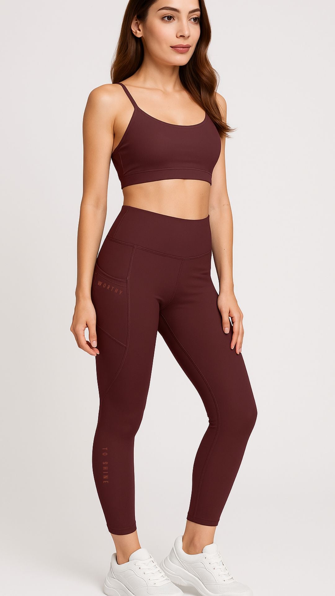 Passionate burgundy pairs with eco-conscious design. Pockets printed with “WORTHY” affirm your value, while the right leg cue “TO SHINE” reminds you to take up space. Made with recycled fabric, these leggings balance sustainability with affirmation armor — moving your body and protecting your planet.