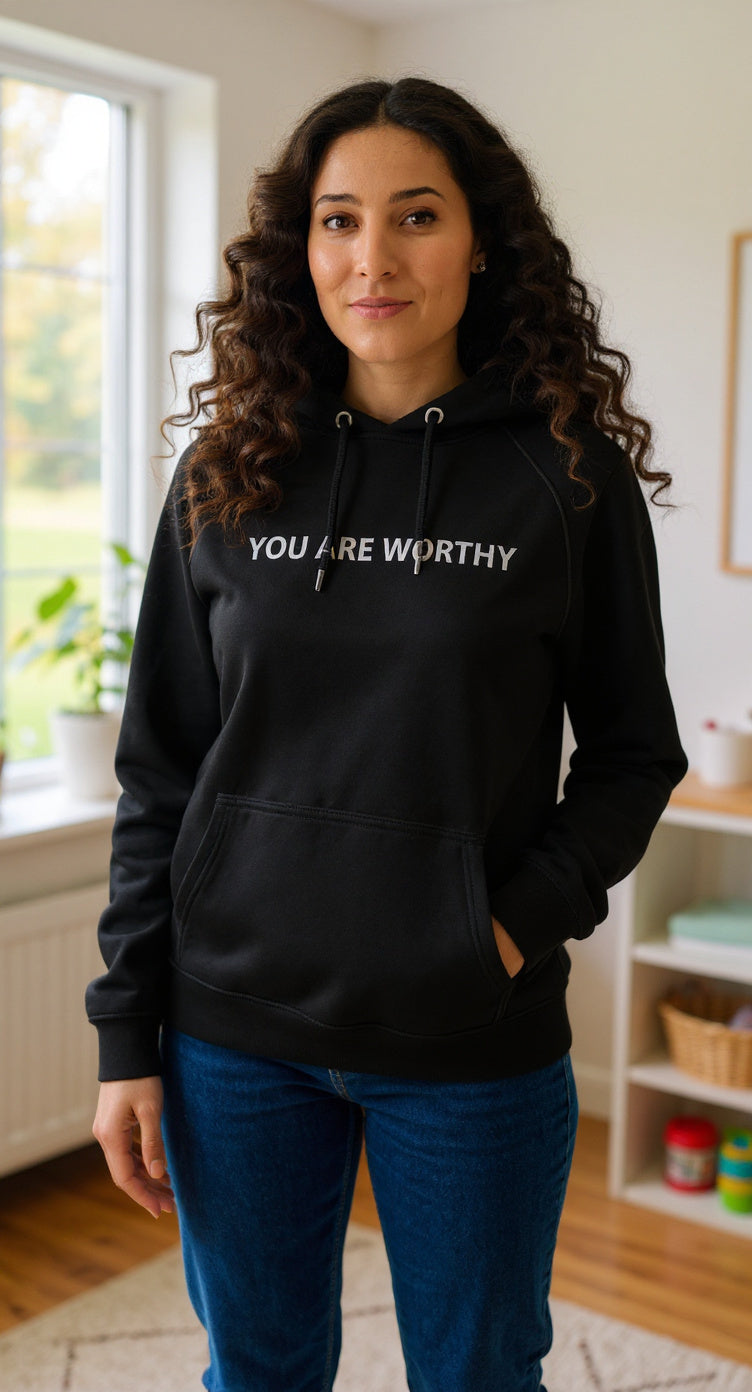 This hoodie came from a moment I realized I’d been dimming myself just to fit in. I wanted to create something that would let you step out with quiet confidence. That’s why “You Are Worthy” sits boldly across the chest, while subtle wrist reminders whisper resilience only you will notice mid-motion. Worn in jewel tones that radiate strength and visibility, it’s more than cozy—it’s your polished armor of presence.