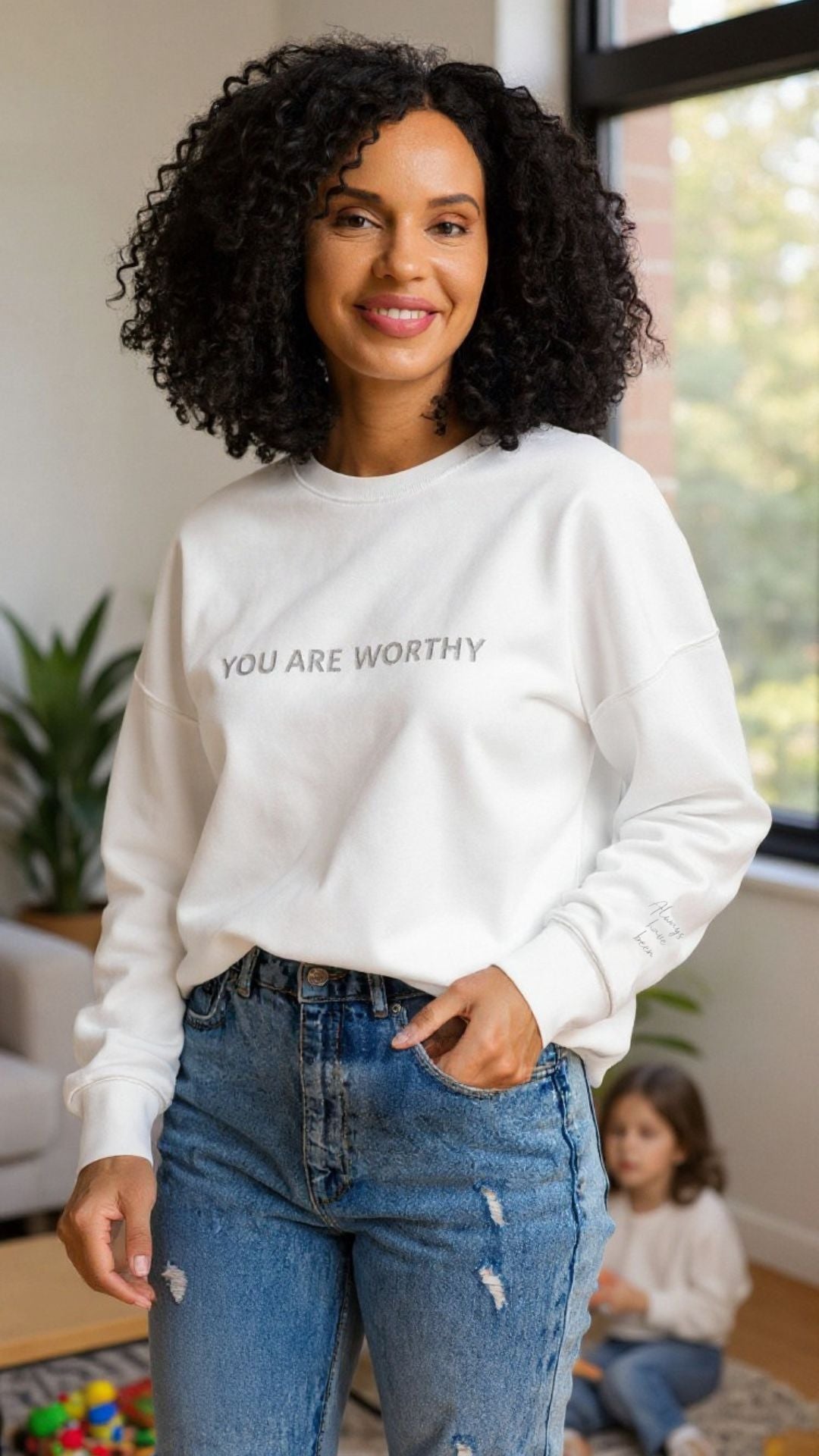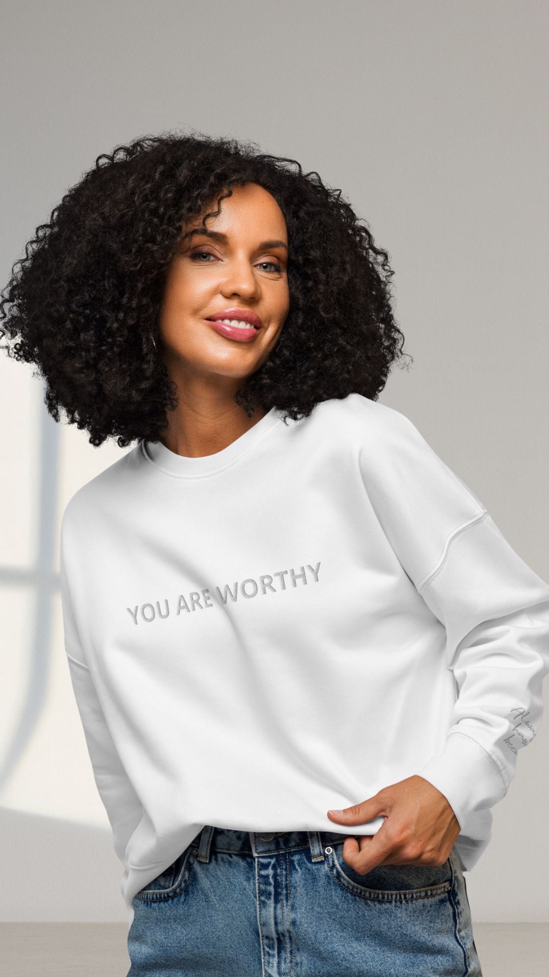 ⦁ Embroidered affirmations: “You Are Worthy” (chest), “Always Have Been” + “Always Will Be” (wrists).